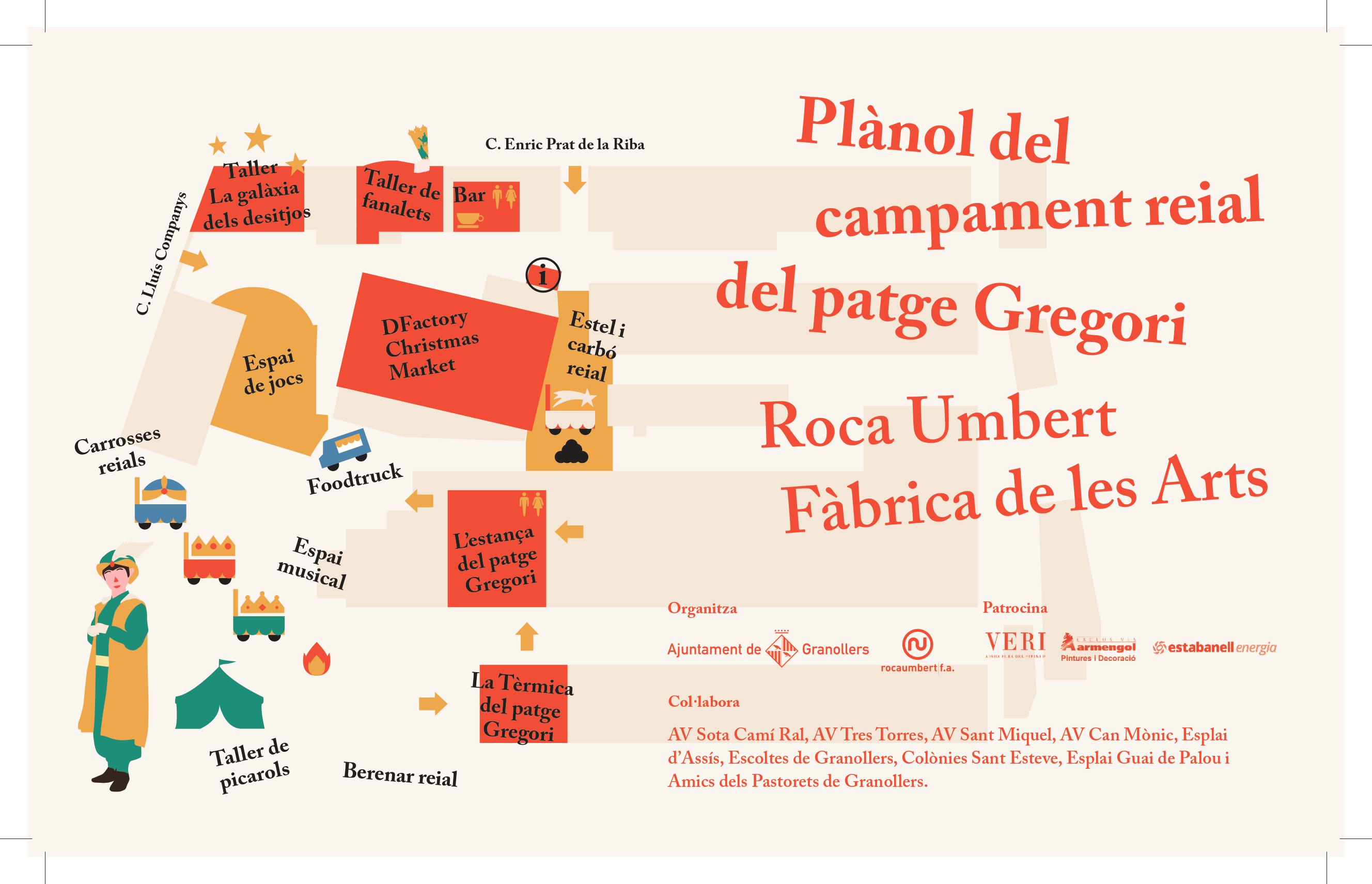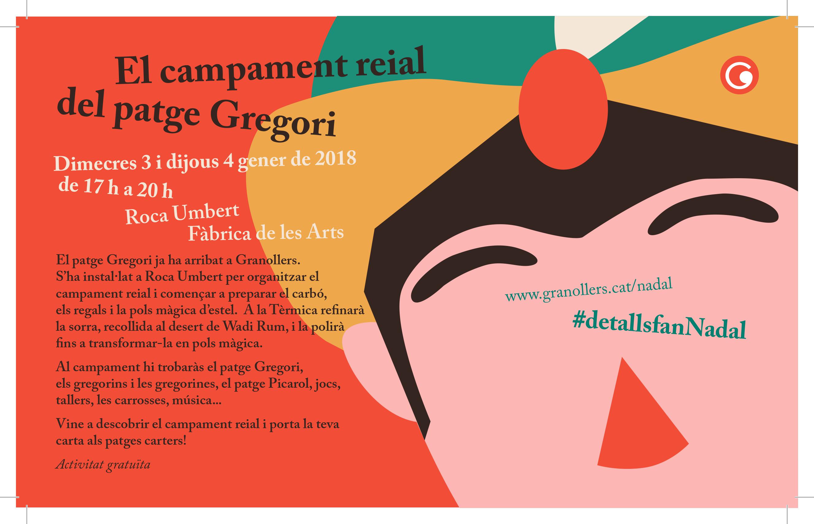 El campament reial del patge Gregori s'instal·larà per tercer any a la Fàbrica de les Arts i s’obrirà al públic els dies 3 i 4 de gener, de 17 a 20 h. Els nens i nenes podran entrar a l'estança del patge Gregori on el veuran en directe i visitar la Tèrmica, on podran seguir els preparatius de la nit de Reis i veure com es refina la pols màgica, i les piles de regals. A l'exterior, hi haurà les carrosses de Ses Majestats amb els patges carters, la xocolateria reial, la foguera per escalfar-se, un espai de jocs i música en directe amb Combo. Taller de Música. En l'apartat de tallers, els infants podran apuntar-se a "La galàxia dels desitjos", amb la il·lustradora Clara Sáez, fabricar el seu desig per a l'Any Nou i enlairar-lo a la galàxia. També, podran confeccionar els picarols que serviran per despertar els Reis el dia 5, així com els fanalets per guiar-los en el seu camí per Granollers (aquest darrer, es podrà fer els dies 2, 3 i 4 de gener, de 10.30 a 13.30 i de 17 a 20.30 h ; i el dia 5, de 10.30 a 13.30 h).