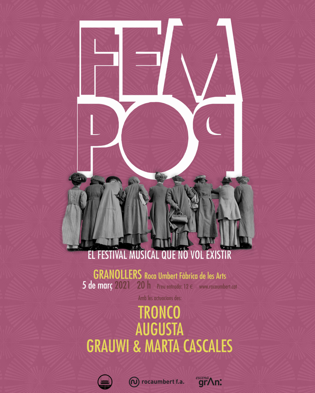 Torna FemPop (El Festival Musical Que No Vol Existir) a la fàbrica per a una tercera edició! Alcem el puny contra la desigualtat de gènere en la indústria musical amb un festival que dóna tot el protagonisme a les dones. Celebrarem el Dia Internacional de les Dones amb concerts de les fabuloses Tronco, Augusta i Grauwi + Marta Cascales.